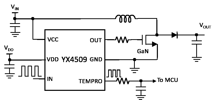 The YX4509 is a high performance single-channel low side gate driver designed for use in high-speed GaN FET and Si MOSFET applications. Its low propagation delay and high peak current make it suitable for a range of applications including LiDAR, time-of-flight, facial recognition, and power converters. The YX4509 can deliver high peak current up to 4A source and 8A sink into capacitive load. The integrated LDO achieves wide supply voltage up to 35V. It also supports temperature sensing out to allow the user to detect die temperature of the driver. The YX4509 features under voltage lockout (UVLO) and over temperature protection (OTP) enhance the safety and reliability of the device. The YX4509 is available in an industry standard and small 6-lead DFN 2mmx2mm package with exposed pad and low parasitic inductance and resistance, suitable for high frequency power systems.